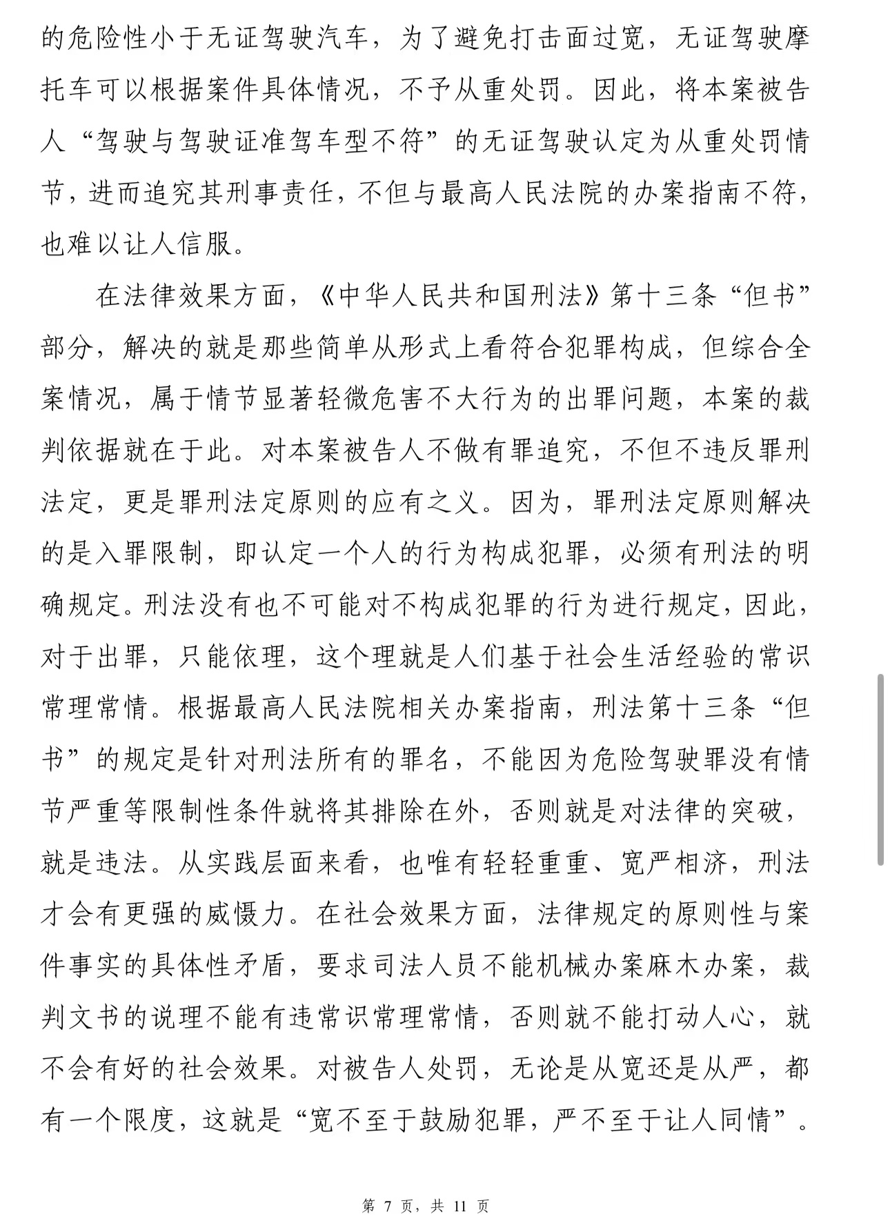 这起酒精明显超标的案件,万法官凭借自身过硬法学理论功底以刑法的 十三条"但书"部分做为裁判依据,依法依理的对本案被告人不做有罪追究,不但不违反罪刑法定,更是罪刑法定原则的应有之义。“因为,罪刑法定原则解决的是入罪限制,即认定一个人的行为构成犯罪,必须有刑法的明确规定。刑法没有也不可能对不构成犯罪的行为进行规定,因此,对于出罪,只能依理,这个理就是人们基于社会生活经验的常识常理常情。根据 高人民法院相关办案指南,刑法 十三条"但书"的规定是针对刑法所有的罪名,不能因为危险驾驶罪没有情节严重等限制性条件就将其排除在外,否则就是对法律的突破,就是违法。从实践层面来看,也唯有轻轻重重、宽严相济,刑法才会有更强的威慑力。在社会效果方面,法律规定的原则性与案件事实的具体性矛盾,要求司法人员不能机械办案麻木办案,裁判文书的说理不能有违常识常理常情,否则就不能打动人心,就不会有好的社会效果。对被告人处罚,无论是从宽还是从严,都有一个限度,这就是"宽不至于鼓励犯罪,严不至于让人同情"”。